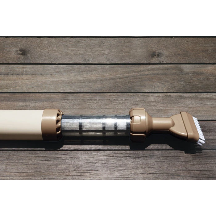 ĂquipĂ© d’une mini pompe manuelle (sans tuyau ni cĂąbles), celle-ci vous permettra d’aspirer les saletĂ©s dans le filtre transparent.