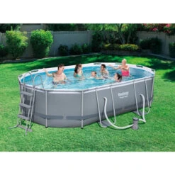 La ligne de piscines Power Steel Frame de Bestway propose des bassins de forme ronde, rectangulaire ou ovale jusqu’Ă 7,32 m de longueur ou 5,49 m de diamètre pour une profondeur variant de 100 Ă 132 cm. Ici profitez d’une piscine ovale de 4,88 m de longueur, 3,05m de largeur et 1,07m de profondeur. Sa forme ovale permet d’avoir un bassin compact qui ne requiert que peu d’espace.