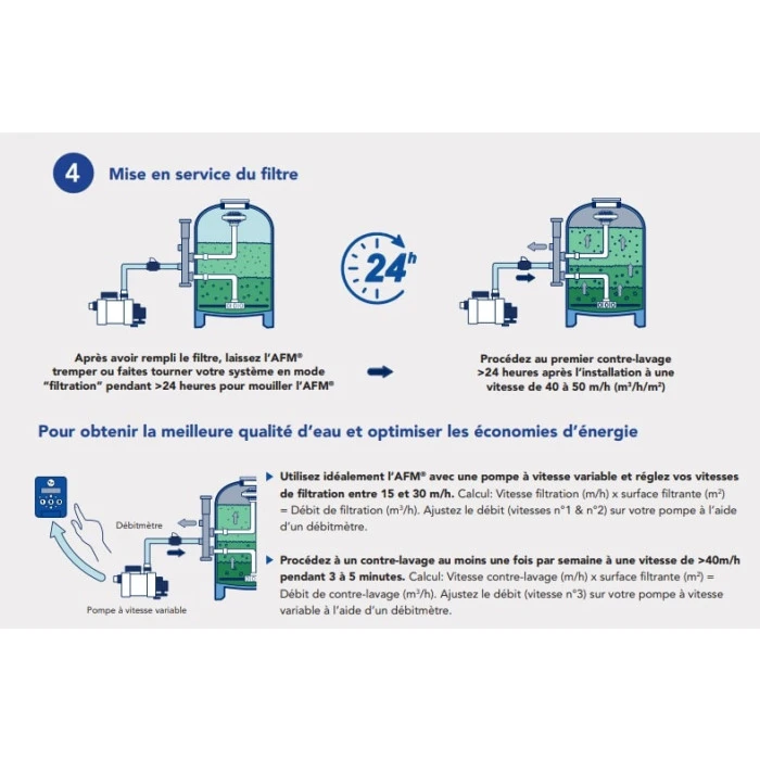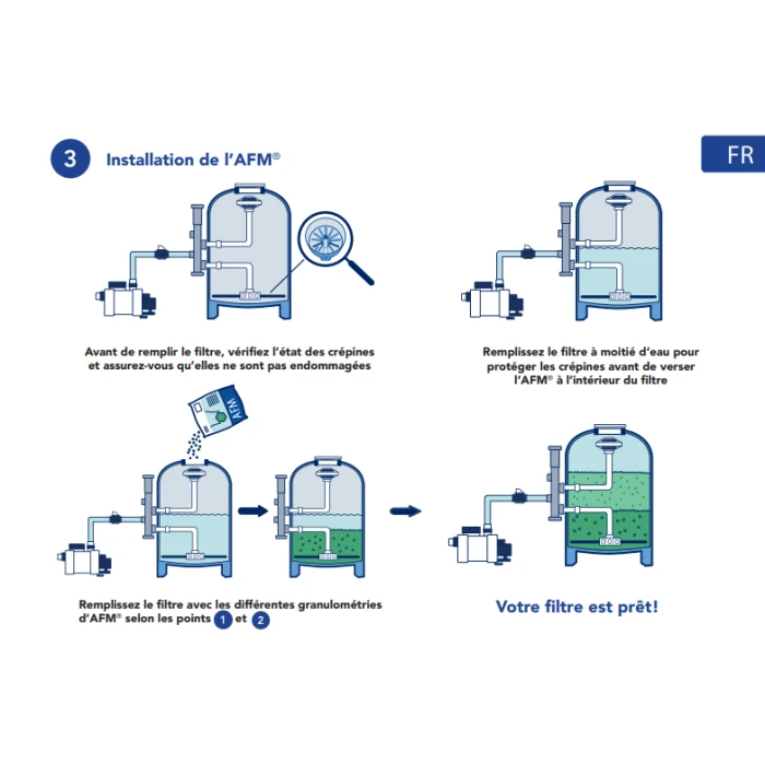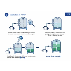 Avertissements : AFM® est environ 15 % plus léger que le sable. Si besoin de 100 kg de sable pour un filtre, utiliser seulement 85 kg d’AFM®