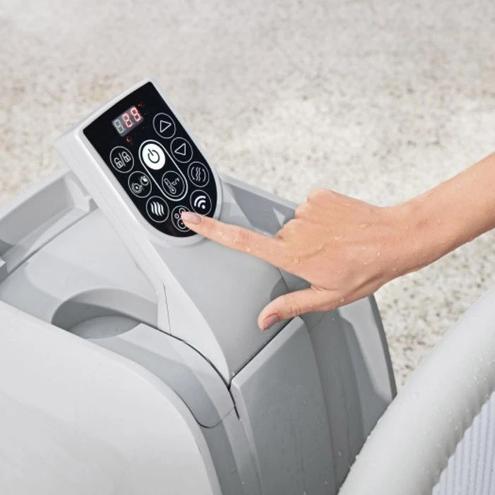 Facile à installer, ce spa dispose d’un système de gonflage avec la pompe fournie (avec un dispositif différentiel à courant résiduel). Celle-ci est contrôlée numériquement grâce à un système de commande tactile qui vous permet de gérer de A à Z le montage de votre spa. Le gonflage est rapide, mais le dégonflage aussi grâce à un raccord d’évacuation de l’air supplémentaire qui vous permet de commencer la procédure de dégonflage rapidement afin de le ranger par la suite.